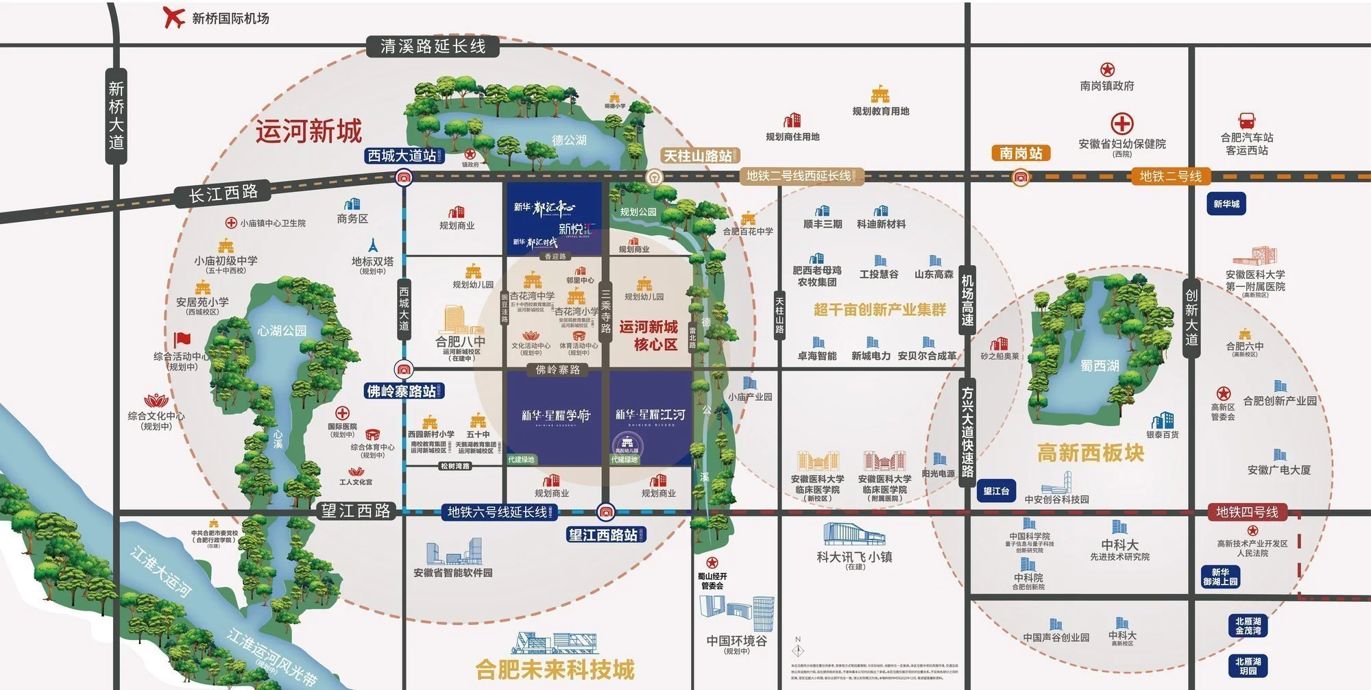 地段优势无疑是该项目最突出的核心竞争力之一。位于国家高新技术产业开发区与运河新城交汇处,这里是合肥市重点打造的五大发展片区之一,也是全国第五座未来科技城的重要组成部分。区域承接高新区产业外溢红利,又与滨湖科学城形成双向辐射效应,未来将汇聚产业集群和全球高精尖人才。随着政策支持不断加码,这里有望成长为新区和合肥西部的城市门户。